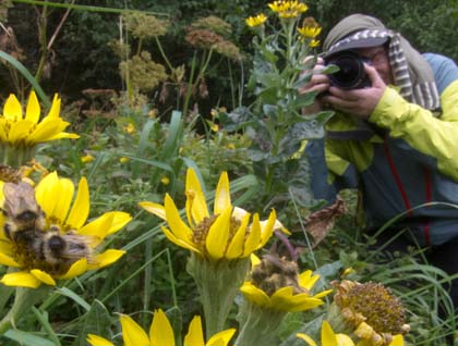In the morning, we explored Idaho Inlet. Whether by kayak or hiking, wildlife was abundant.  A salmon stream attracted many hungry critters from eagles to sandpipers. Kayakers entered a bit of the stream while walkers enjoyed the banks.  A coastal meadow was filled with a rainbow of flowers, from white orchids, to red paintbrush, to purple monkshood. One certain highlight were the large yellow beach sunflowers, many with big bees pollinating them. Being very mellow bees, they allowed for close-up macro photography.