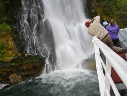 Ideal Cove, near the southeast corner of Mitkof Island and the southern terminus of Frederick Sound, offers an entry into a magnificent section of Southeast Alaska’s temperate rain forest. A bit of fog, low clouds, and drizzle gave way to high thin clouds by the beginning of our outings. The ocean’s brownish tint came from the Stikine River, the major drainage in this area, ending its flow through its nearby delta. Distant and scattered, icebergs from the LeConte Glacier were seen in the embayment to the north.