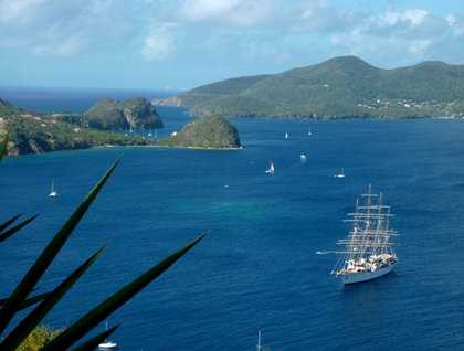 We sailed from Cabritz point Dominica to the Iles des Saintes and anchored about 7 p.m. in the lovely picturesque harbor of the main city in the Iles des Saintes (“The Saints”). The early morning was marked by a little rain but also by the most wonderful double rainbow, which made a semi-circle over the archipelago. The capital of “The Saints” is simply called “Bourg,” or in English the “City.” It is so petit that it hardly qualifies for the name “Hamlet,” but it is picturesque in a remarkably continental French way. The town’s two most imposing buildings are a lovely Catholic Church and a town hall, proclaiming “Liberté, Egalité and Fraternité” those ideals emerging from the French Revolution. The archipelago consists of seven volcanic islands but only two have all year residents. These seven islands along with the much larger island of Guadeloupe comprise the French “Départment of d’Outré Mer.” These islands are a part of France and have approximately the same relationship to the mother country as the Hawaiian Islands have to the continental United States. The inhabitants are French citizens, vote in all elections, and have all the perquisites of being French citizen and a member of the European Union. As such the official currency here is the Euro. And the shops are not inexpensive.