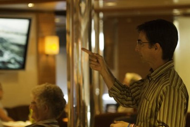 The rest of the day was spent at sea. During lunch, we passed close by mountainous Ilha de São Sebastião, and then sailed away from the coastline and lost sight of land…except for a distant view of Ilha de Alcatrazes (an island we suspected is a seabird nesting site, but off limits to us because it is a military site). The waters we sailed in today are quite shallow, covering part of the South American continental shelf, and looking on the chart, we could see the bottom is also very flat, varying between 55 and 60 meters (180 – 200 feet) in depth.