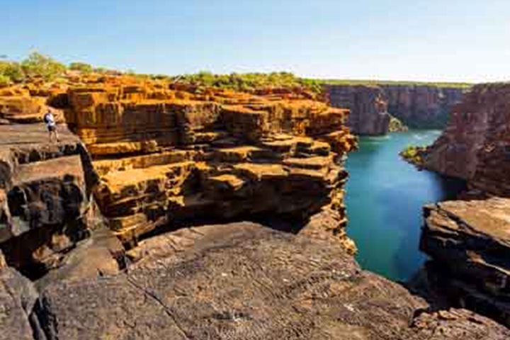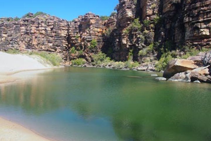 This morning we awoke to a spectacular Kimberley sunrise where Mother Nature created a few new colors. She also produced a quite breezy day, just enough to keep the temperature down. Our intrepid adventurers boarded the Zodiacs at 7:00 a.m. and made our way across a choppy Koolama Bay to the mouth of the King George River. As our flotilla of Zodiacs snaked its way along the river, we saw the stunning beauty of the gorge and the natural colours of the sandstone, exposed by the erosion taking place relentlessly. As we journeyed upriver, we observed osprey nests, eastern reef egrets, pied oyster catchers and of course salt water crocodiles. The sandstone canyon was spectacular and we took a plethora of pictures that we knew would not do the scenery justice. Close to the edge of the river and the falls, we saw great examples of ‘honeycomb erosion’ where water whipped up by the wind has dried within the sandstone structure, dislodging particles one at a time. A number of us had chosen the five-hour tour that included a hike to the top of the falls. After a brief chance to take photos of the waterfalls, we motored toward the north-eastern bank to commence the climb up the side of the gorge. With our expedition leader Darrin leading the way, we trekked up the steep track to the plateau from where we made our way to the top of King George Falls. The view was stunning and the clicking of camera shutters could be heard constantly. We saw the Zodiacs cruising along the sandstone walls, our fellow guests peering upwards in awe and the Zodiacs leaving a white trail of foam as they journeyed to their destination at the end of the gorge. A few of us could not resist the call of the inviting water and slipped in for a refreshing swim. Although it was quite shallow as this is nearing the end of the dry season, it was refreshing, it was then time to slowly make our way back down 100 meters below to our waiting Zodiacs. To our surprise, the ships galley had organized a treat for us once we had returned from the falls. Tucked in behind a rocky cliff hid a refreshment Zodiac, with champagne, orange juice and gourmet croissants being served. For those of us who didn’t do the walk up the falls there was a opportunity to do a mystery tour, to a secret lagoon across the other side of Koolama bay, and what a treat it was to turn a corner of a massive cliff to see a beautiful lagoon trapped by the falling tide, the surprises just keep on coming. The final Zodiacs arrived back to the National Geographic Orion just as the sun was slipping below the horizon and we were all treated to yet another display of colours that were unknown to us before our expedition in the Kimberley began.