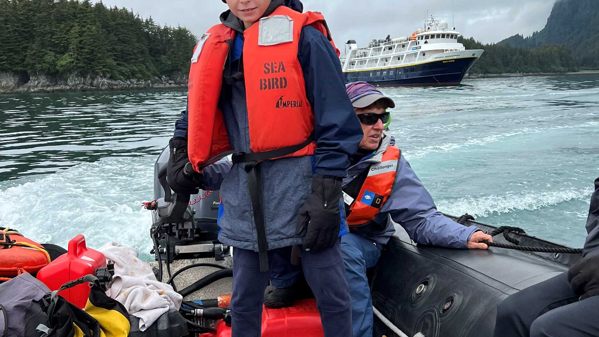 We anchored at the northern entrance to the Inside Passage, where Icy Strait meets the Gulf of Alaska. This is a highly productive wildlife spot, particularly when the tide comes in. Lots of big water comes in as the Pacific Ocean funnels through narrow Icy Strait into the Inside Passage. The current mixes things up, bringing lots of deep-water fish up to the surface. These fish attract eagles, otters, Steller sea lions, and whales. Humpback whales were observed lunge-feeding. They followed the shoreline of one of the islands for over a mile as they corralled fish against the steep cliffs and captured mouthful after mouthful of the small fish. Steller sea lions caught halibut, too big to swallow whole. The sea lions can’t chew up their prey as we do so they have to get creative, shaking the fish back and forth and flinging them out of their mouths to help tear them apart. These animals were so intent on eating their meals that we had ample opportunity to photograph and video their behavior. For an exciting finale to the morning, our young Global Explorers learned how to drive our expedition landing craft, and they spent the remainder of the morning piloting the crafts around the harbor.