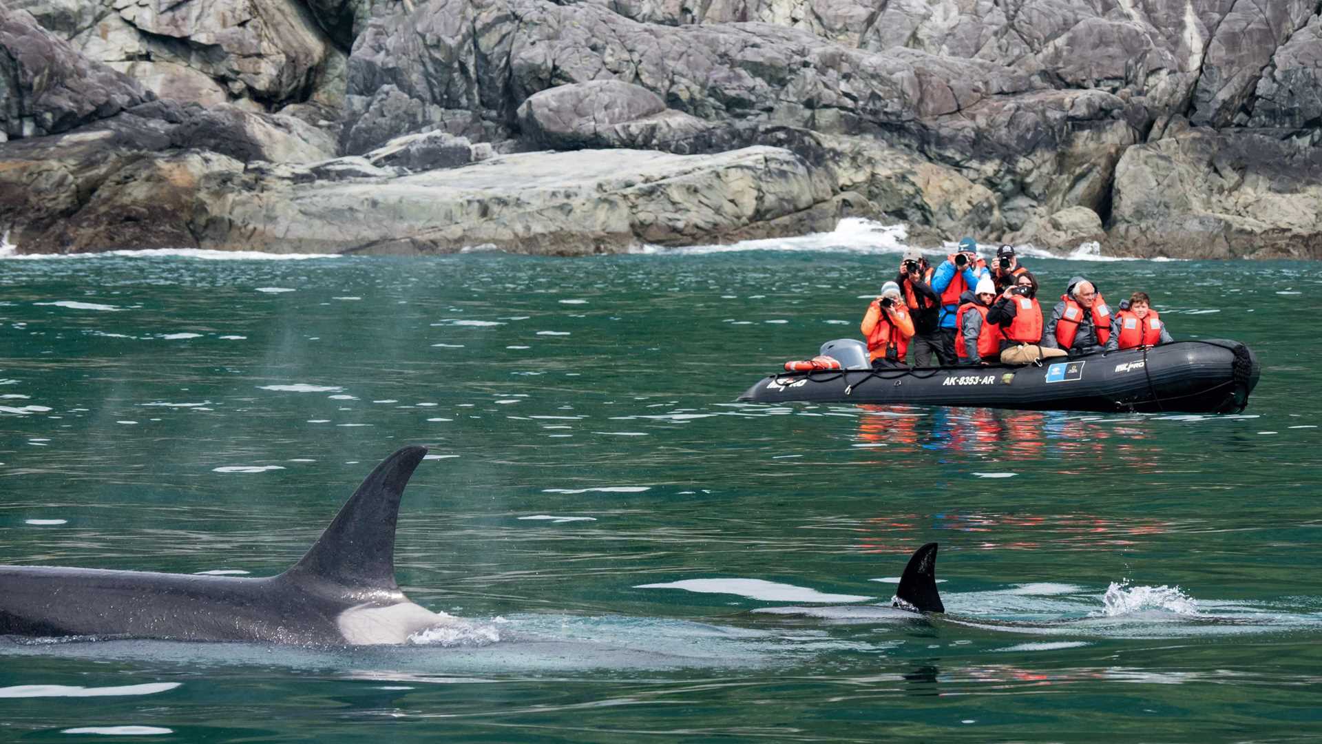 Before breakfast, blue skies and views of the Fairweather range were the setting for a humpback whale mother and calf. Shortly after we set off in our fleet of Zodiacs to explore the Inian Islands. This set of small islands is along the outer coast and with the rising tide, water was pouring in through the passes between islands. An exciting ride was had by all and a variety of wildlife was spotted. Everyone enjoyed sea lions and sea otters, and many tried to decide which was their favorite. Some got to see tufted puffins and humpback whales, while some lucky folks got to spend time with my favorite animal, killer whales. A pod of resident, or fish-eating orca were cruising along the shoreline. A calf was quite active and two adult males with tall six-foot dorsal fins were massive.