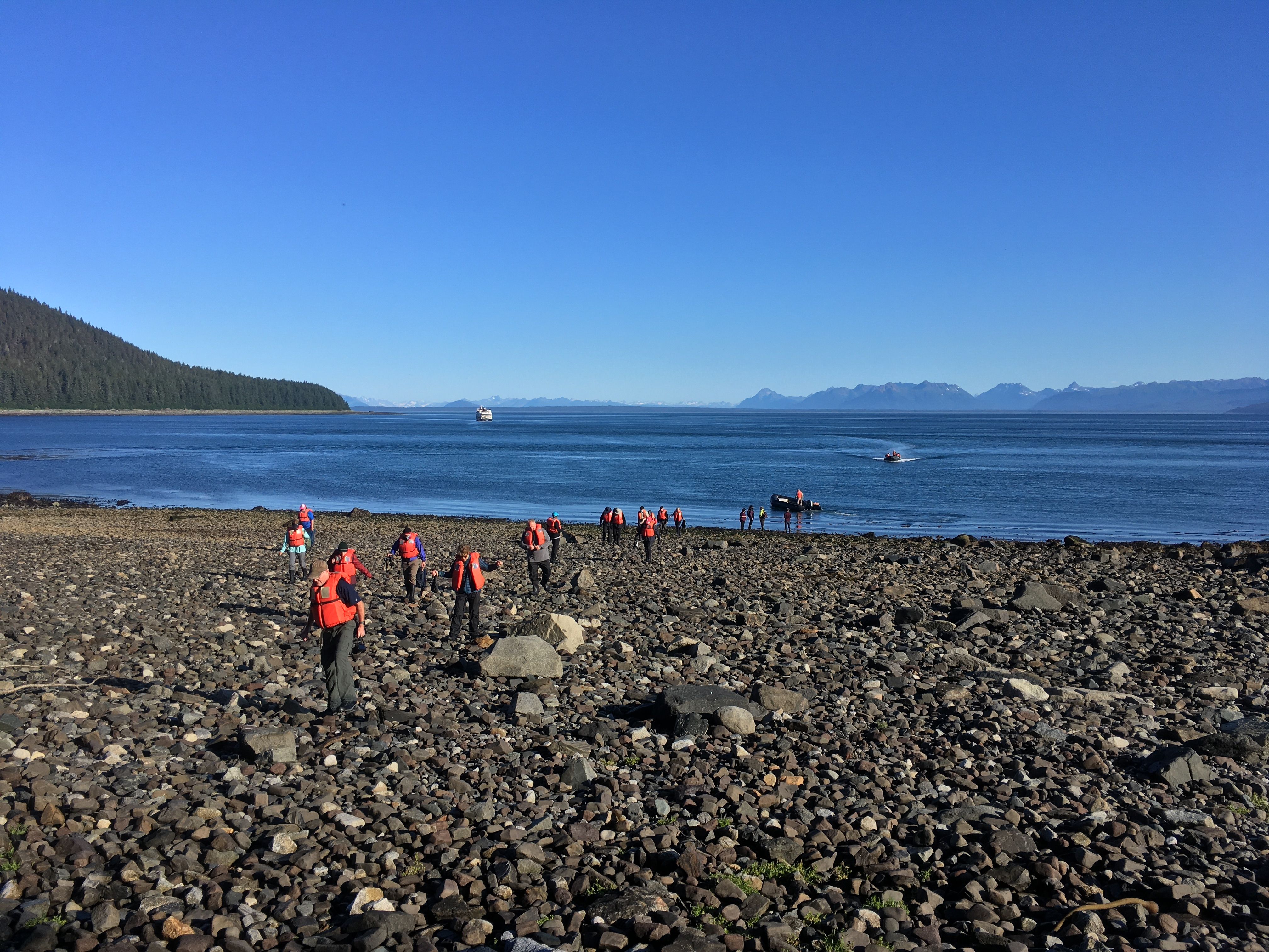 We spent our afternoon exploring George Island, both on foot and in kayaks and paddleboards. This was our first close look at the rocky shoreline and the cloak of temperate rainforest on the bedrock, both showing the rich flush of life that has developed here since the end of the last ice age. Here on George Island, the pattern of the forest is overlain by the mark of humans, as the area is the site of a gun emplacement, manned by soldiers during World War II, to defend this nostril as an entrance to prime Allied shipping lanes, and a potential route for an Axis invasion into North America. Some capped off the day with a “polar plunge” to celebrate our first full day of exploration.