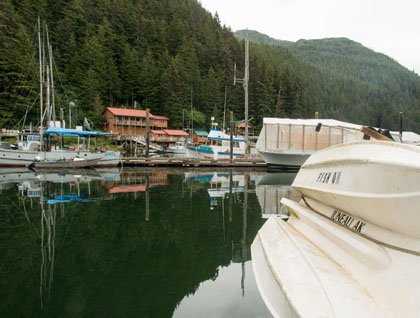 Our morning was filled with excitement as we leapt onto our expedition landing craft and puttered out into the Inian Islands. Known as the "Serengeti of Southeast," the Inians sported a variety of sea and avian life focused on search-and-destroy missions targeting fish caught in the turbid waters of a flooding tide. Steller sea lions frolicked and smacked fish against the water's surface, breaking them into bite-sized chunks and providing a quick buffet table for the gulls. Tufted and horned puffins buzzed the boats, pigeon guillemots peeped, and eagles swooped from the trees to snatch fish from the waves. A humpback whale arced between the expedition landing craft and jellies surfed the currents. Mary Jo Lord, a guest invited aboard from the tiny community of Elfin Cove, entertained us with stories of life in small town Alaska, and after lunch we walked full circle around the boardwalk community.