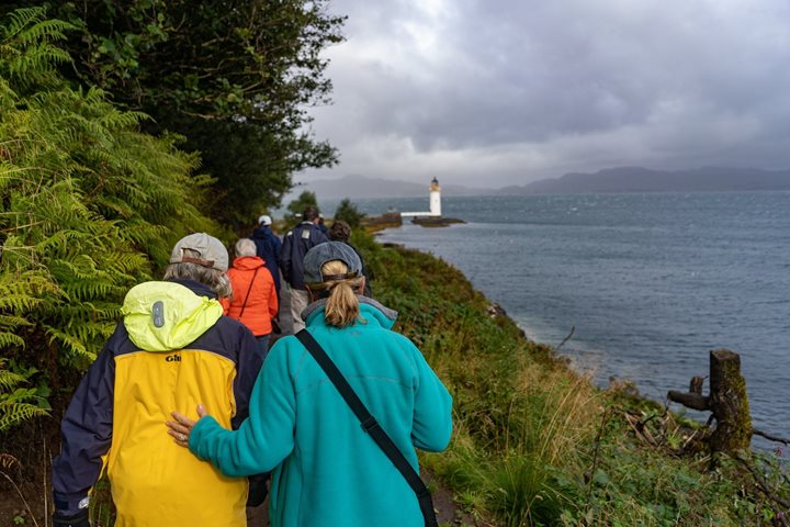 Our mid-day sail brought us to the Sound of Mull, the sky darkening as the afternoon progressed. We arrived in Tobermory just as rain started and the morning’s bright sunshine slipped into memory. But nothing can diminish the cheerfulness of Tobermory’s colorful waterfront, the buildings recently spruced up for a children’s television show that was filmed in the village. Even as rain fell, a few hearty folk set off to walk and take photos with Steve and Robin, while others explored the town with its shops, museum, aquarium, warm pubs, and even a distillery.