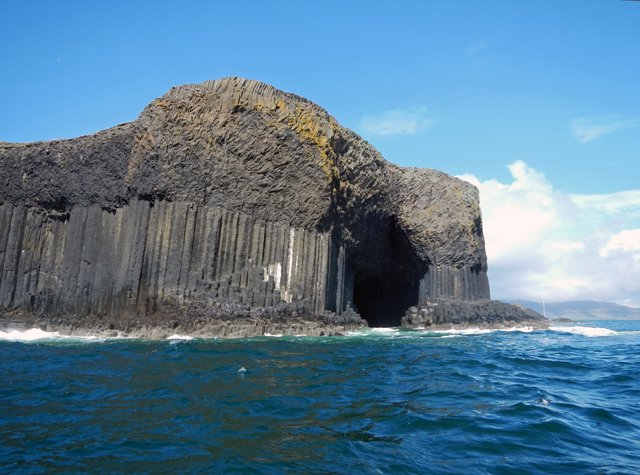 In the afternoon we visited the nearby island of Staffa, which displays some of the finest examples of columnar basalt in the world. The basalt has been eroded on one corner to produce Fingal’s Cave about which Felix Mendelsohn composed the Hebrides Overture. We were able to go ashore on Staffa and see the basaltic column up close and also to walk along the beautiful grass covered hills to a large Atlantic puffin colony and to see the birds standing in front of their nesting burrows and flying out to sea to feed near the island. We also took Zodiac rides along the coast of the island and were able to get close views of the puffins and the eider ducks on the water.