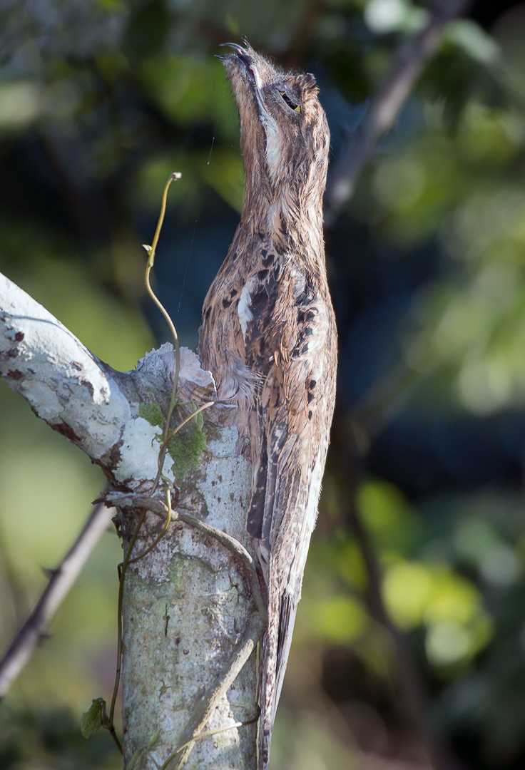 Aside from the great views of monk saki and night monkeys, colorful and always spectacular blue and yellow macaws, we found a rarely seen long-tailed potoo. Potoos are nocturnal birds, but during the day they are extremely well-camouflaged. Even if you were near one of them, you would pass by it without seeing it. They perfectly resemble a stump from a tree. Only once you have seen it, can your brain pick it up and separate it from the rest of the tree.