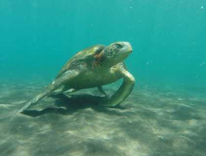 We returned to the ship and donned our snorkeling gear then boarded the Zodiacs and motored into a calm bay where we found dozens of sea turtles. Really, this snorkeling outing was marvelous! There was an incredible concentration and variety of wildlife in the water with us! I have mentioned this before about Punta Vicnete Roca: but where else on earth can one snorkel with animals from 4 different orders? Mammals (sea lions and fur seals), reptiles (sea turtles and marine iguanas), fish of dozens of species (king angels, harlequin wrasse and big fast mackerel) and birds (penguins and cormorants) were all swimming, feeding, and resting all around us!