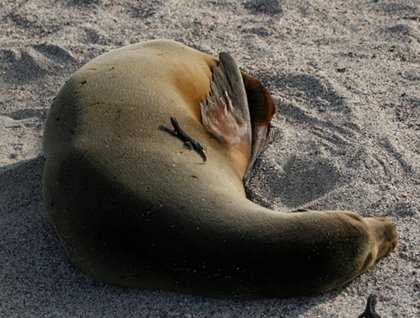 The afternoon walk was fantastic! Against the backdrop of the huge, barren shield volcano, we skirted tidal pools and hiked on pahoehoe lava among hundreds of marine iguanas, flightless cormorants and the ever charming Galapagos sea lions. We found a newborn sea lion pup with its umbilical cord still attached and some of us spotted a Galapagos racer snake.