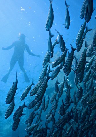 We returned to the ship and wiggled into our wet suits, then boarded the Zodiacs and went snorkeling in a calm bay where we found sea turtles swimming and sleeping. There were many fish, of a dozen different varieties, and even some predatory sierra mackerel that darted in to chase small bait fish. Sea lions swam among us and we thoroughly enjoyed the outing!