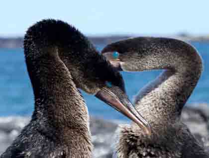 After breakfast we joined Captain Patricio in the bridge and watched the 00.00 appear on the GPS as we crossed the equator. Once the ship was anchored we boarded the four Zodiacs and cruised the coast at Punta Vicente Roca. Thanks to high winds, this was an exciting “panga ride” and we were delighted to find at least 100 sea turtles in the area, plus sea lions, very large marine iguanas, penguins and our first flightless cormorant. The best sighting of all was a huge manta ray that swam along beside several of our Zodiacs in turn.