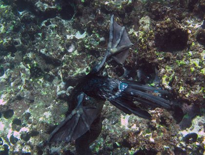 By late morning we were back on board and getting ready to go snorkelling. The water temperature was dramatically cooler than back east – by 6 degrees F! This is good news for the marine life of Galapagos. It means up-welling is taking place, which in turn means nutrients are being brought to the surface to feed the lowest levels of the food chain. It’s been a very hard two months in Galapagos for our penguins and cormorants. Fingers are crossed the food supply will pick up soon.