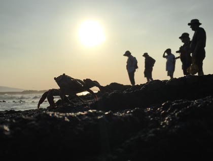 With the first beams of sun, early risers tried to find some marine life from the sundeck while we circumnavigated the north of Isabela Island.  The gigantic Ecuador and Wolf volcanoes looked spectacular with colorful lava fields decorated with a yellowish color, harmonizing with the sun on this beautiful morning. After breakfast the captain announced our arrival at the equator and we celebrated with a special ceremony, while we crossed we did the limbo under the Ecuadorian flag. As soon we dropped anchor at Punta Vicente Roca we headed our Zodiacs along the Ecuador Volcano to observe evidence of the last eruptions which occurred long ago.  Long lines of black lava, or dikes, decorated the gigantic volcano while in the air brown noddy terns, blue footed boobies, and frigate birds looked for some food. The sun appeared, warming up this place and marine iguanas did not lose time and started swimming, trying to eat some seaweed.  Galapagos penguins joined in the fun and fast as torpedoes hunted and fed on small black striped salemas. We headed back to the National Geographic Islander so our guests could get ready for the snorkeling activity. Our explorers found different species of fish, but probably the most incredible creature that impressed us the most for its tameness were the Pacific green sea turtles. Of course, Galapagos penguins and flightless cormorants delighted our guests who enjoyed swimming with incredible creatures like nowhere else in the world.