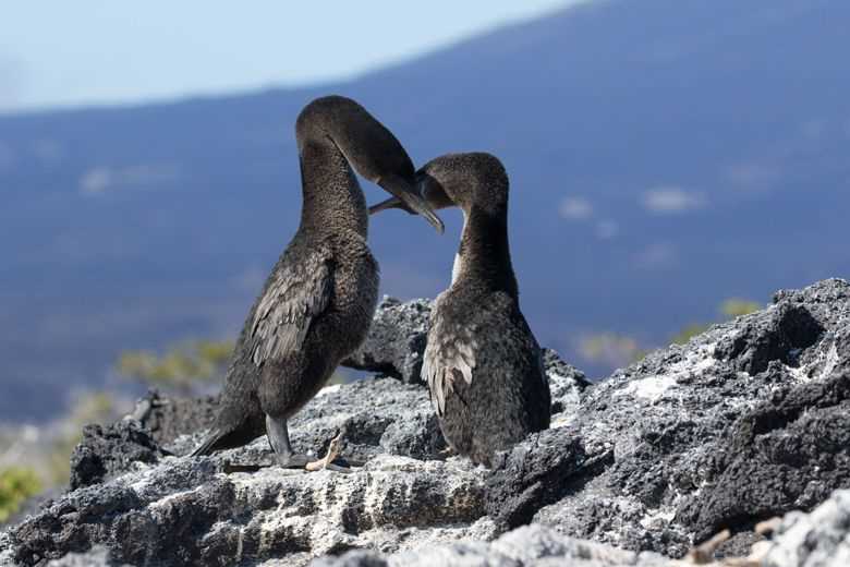 Along the walk, we spotted a couple of Galapagos hawks flying low and close to the ground in search of any distracted prey. These raptors are the top land predators in the Galapagos. A small colony of Galapagos flightless cormorants were also observed by the shoreline of Punta Espinoza. Some Cormorants were building nests, mostly made from brown kelp algae and pieces of sea stars and fish bones. It’s quite a show to see the mating rituals of these endemic flightless birds.