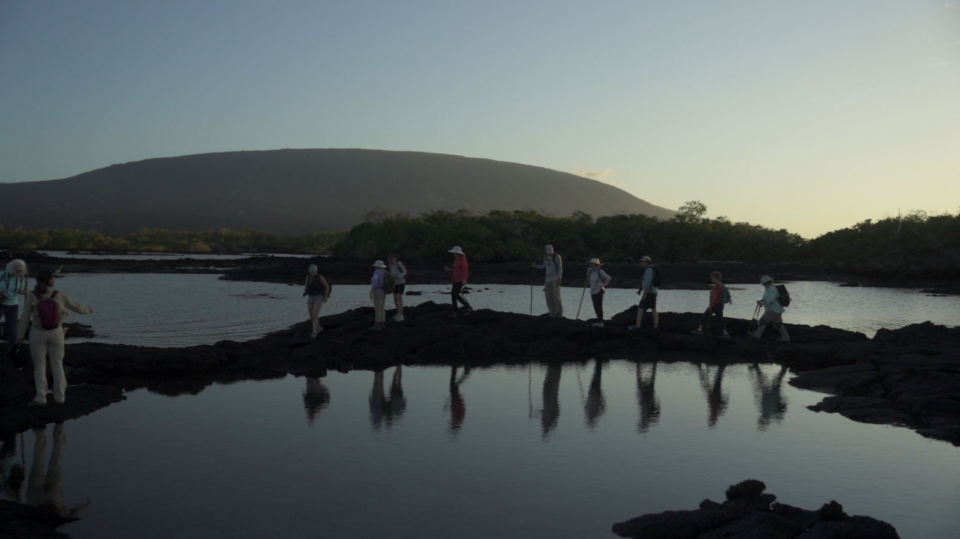 Today we woke up very early to find marine life in the light of the sunrise. Some of us had a stretching session with wellness specialist Estefania. It was very relaxing since we were surrounded by the landscape of the collapsed caldera of the Ecuador Volcano. Right after breakfast, we crossed the equator. We had a gathering on the front deck, and a naturalist carried an Ecuadorian flag as we symbolically crossed the equatorial line.