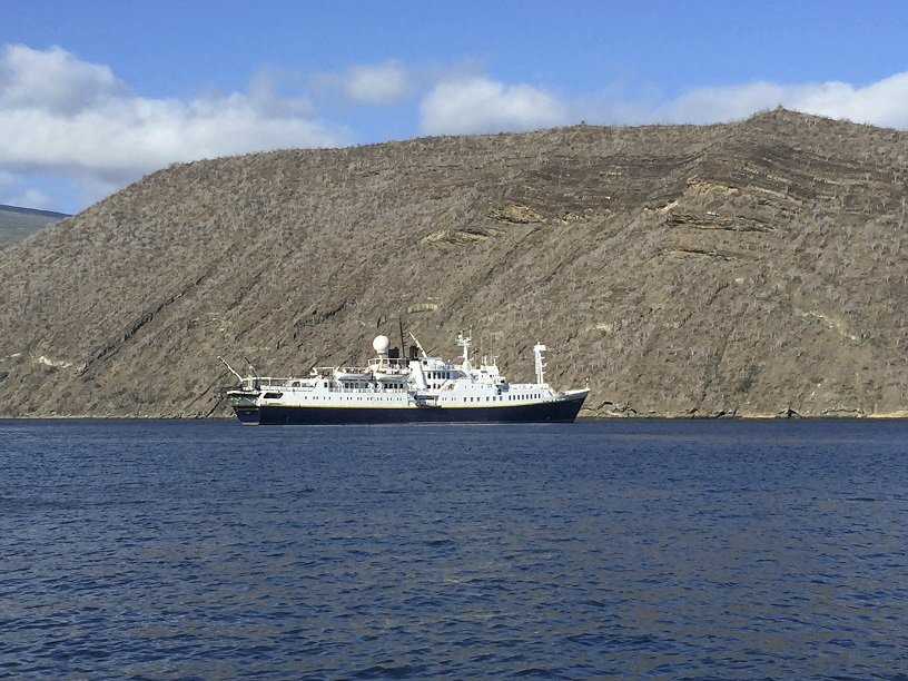 After a delicious Ecuadorian lunch, our guests prepared for water activities, this time at a different visitor site known as Tagus Cove. This is an eroded tuff cone whose western flank has collapsed, thus granting us entrance to this marvelous location within the cone. We offered kayaking along the walls of the cove, so our guests had the opportunity to see the nesting flightless cormorant, Galapagos penguin and several sea turtles as their heads poked through the surface. We offered deep water snorkeling and a hike as a last option of the afternoon, and for our guests who didn’t hike, we took them for a coastal exploration via Zodiac.