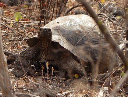 At dawn, the National Geographic Islander pulled into Urvina Bay, located on the western coast of Isabela Island, between Darwin and Alcedo volcanoes (two of the five active volcanoes of Isabela). Immediately following breakfast, everyone went ashore, some to take a vigorous long hike with challenging rocky crossings, others to avoid those and stick to the level, smooth portion of the trail leading into the interior. Wonderful Galapagos! Upon landing, we had quite the drama of over ten Galapagos penguins fishing a thick school of small fry fish, in competition with two brown pelicans – just feet from the shore! It was already a successful outing by anyone’s standards. On the trail, Darwin’s finches introduced themselves, and the Galapagos mockingbirds were starting to construct nests. Tracks in the trail led us to bright yellow and orange land iguanas, as well as hinted at the presence of giant tortoises in the area. Crashing through the brush told us where to look for the latter, and one small female tortoise held her position in the scrub motionless, perhaps bemused by these tall, slender and quick animals that made many clicking noises when happy.