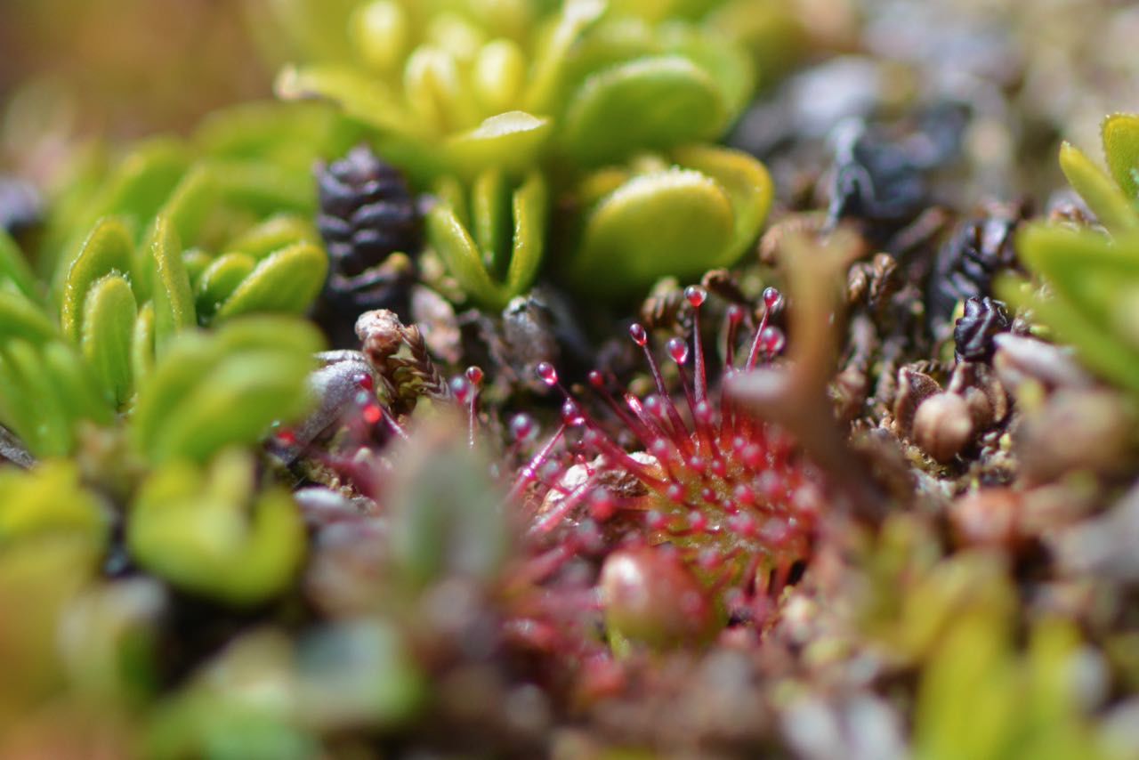 I am lucky that it is sunny making the eighth inch leaves of the sundew sparkle in the light, boldly red. People returning to the landing beach inquire about my mission and undignified posture, and to my surprise become enthusiastic participants in my endeavor.