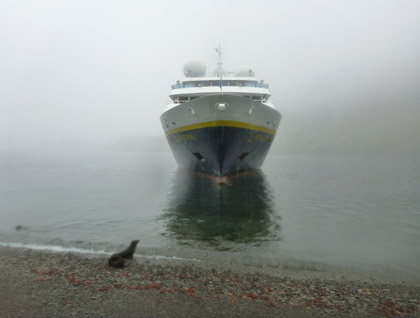 We entered the open Pacific and found it to live up to its peaceful name. Splashing and spouting of several humpbacks caught our attention. The ship’s officers maneuvered us into position to watch what appeared to be competitive male behaviors including dramatic tail throws as in the photograph. It was exciting to see the differences between these animals and the gray whales that we have enjoyed the past few days.