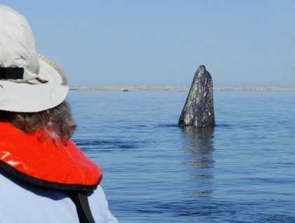 Eager whale watchers boarded the rubber boats for our final outing to watch these magnificent mammals from water level. Backs and spouts broke the glassy surface in almost every direction. With no shortage of cow/calf pairs, we spread out to see individuals spin just beneath the surface, spy hop (as in the photo), and approach our boats for close inspections. The time flew by, and by late morning our local pilot had boarded the ship in readiness for our transit back to Magdalena Bay. He departed after carefully negotiating the narrow and shallow channel, and the ship continued towards the opening between Isla Magdalena, our home for the past few days, and Isla Santa Margarita, a mountainous island of metamorphic rocks.