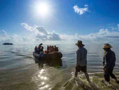 Back onboard by late morning, we gathered in the lounge for introductions to the boat and the staff, while the crew reloaded DIBs and National Geographic Sea Lion got underway to head north. Immediately after lunch we had our first whale sighting—a humpback whale very near the ship. We stayed with it for awhile, tearing ourselves away to press on northward. Some bottlenose dolphins passed us in the distance, on their way to some pressing engagement. What a lovely taste of things to come, we hope. The rest of the afternoon was spent settling into our shipboard home and preparing for the next few days. We napped, relaxed on deck, unpacked, attended presentations about cameras and photography and whales, and then gathered on deck to share in the sunset. At this writing we are on our way to the lounge for a brief recap, and then to dinner. What a beautiful start to our voyage!