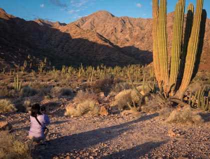 During the night we traveled farther northward into the upper Gulf of California. By early morning we reached the region known as the Midriff Islands where we anchored near Isla San Esteban. As the eastern horizon brightened beneath a waning night sky, the earliest risers headed ashore for sunrise. Once on shore, some people chose to stroll in the quiet of the desert arroyo, enjoying the first songs of waking birds. Others of us ascended a low ridge to watch and photograph the sunrise beyond the arcing silhouettes of majestic cardon cactus.