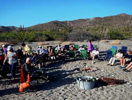 After lunch the ship was on approach to the west side of Isla San Jose. This area (known as Kelley’s Beach) on the island was south facing and gave us a good lee for an anchorage and to put our kayaks and paddle boards in the water. A few people swam in the shallows while others did some beachcombing. Later, once the heat of the day broke, walks into the arroyo were offered. Upon the walkers’ return to the beach they discovered that the hotel department had put together a beachside bar and dinner ashore for the evening. Everyone enjoyed the wonderful food and drink and company as the sun set and gave us a brilliant green flash of light. A campfire was lit for the evening and we watched the moonrise and could see Jupiter rise as well.