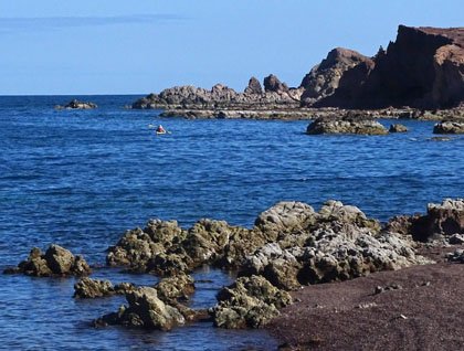 Kayakers set out to explore an exciting and complex shoreline as today’s expedition photo shows. Small grottos and protected coves were surrounded by gnarly rocks that paddlers avoided. Some of our guests had fun with paddleboards. Others cruised in one of our expedition landing craft to look at birds and investigate a bit of the coastline. Our last activity for the morning was snorkeling from a hidden beach accessible only by maneuvering down a narrow rock-filled channel. Once there, guests swam through a cave or out into the open water through the arch shown in today’s expedition photo.