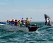 We saw all the classic behaviors: spyhopping, breaching, juveniles rolling around and playing in the shallow shoals, swimming around and under our pangas, a mother who was reluctant to let her small calf get too close, and best of all, a friendly whale who avidly solicited our attention. Shouts of joy echoed across the bay. In addition to the petting, some of us also experienced the lifetime opportunity that is whale breath, to various degrees of appreciation! So many whales! The sheer number of blows all around us was nearly sensory overload. Shouts of Over there! Over here! Off the bow! Off the stern! Spyhopping at 11 o’clock! rippled between our boats. Watch that breach at 3 o’clock! resulted in glancing this way and that, as if we were watching a spirited game of ice hockey. An added touch to the morning’s spectating was the brief presence of bottlenose dolphins and a solitary sea lion.