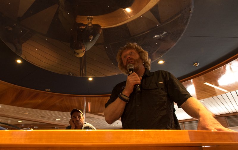 We woke up early in the morning as National Geographic Islander navigated along the northern part of Isabela Island. Slowly the sun appeared above the clouds surrounding Volcano Wolf. We spotted our first birds as Galapagos fur seals returned to shore from their night hunt. We enjoyed a great breakfast. Afterward, expedition leader Vanessa called everyone to the bow to celebrate as we crossed the equator. Our guests happily crossed the line. Approaching Punta Vicente Roca, the visitor site, we spotted Galapagos sea lions and a good number of ocean sunfish. The first activity of the day took place as we dropped anchor at Punta Vicente Roca. This is a spectacular geological site. The combination of the former volcano’s tall cliffs and the tuff cones formed later adds an amazing contrast to this unique visitor site. Our best tools for exploration, our Zodiacs, were lowered down, and off we went to explore the coast. We observed Nazca boobies and blue-footed boobies resting on the small ledges of the tuff cones. Galapagos sea lions swam close to our Zodiac, and Galapagos penguins rested on a broken piece of the tuff cone after feeding. What a wonderful sight! In a calm area, we found a good number of Pacific green sea turtles. The morning’s activities ended with snorkeling. Pacific green sea turtles, plenty of colorful fish, Galapagos marine iguanas and flightless cormorants surrounded us. It was a phenomenal experience! The ship was repositioned toward Fernandina Island. The youngest island of the archipelago, Fernandina is a highlight of our expedition. This island shows our guests the beginning of life. We observed animals thriving in the hostile environment. Pioneer plants like lava cacti grow on the lava fields, breaking down rocks little by little to create soil for the next generation of plants. Punta Espinoza is known for its huge colony of Galapagos marine iguanas. It is hard to distinguish the iguanas from rocks since they are so dark in color. On the other hand, colorful Sally Lightfoot crabs added contrast to the young, dark lava fields. We ended our walk as the sun was setting, returning to the ship with great memories. It was a fantastic day in the western part of the archipelago.