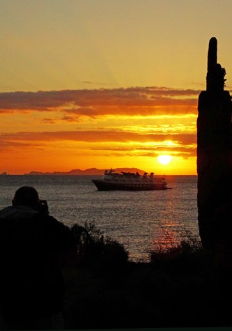 Saturn and Mars gleamed golden and rusty red beside the moon as early risers gathered on the stern in readiness for a pre-sunrise landing on Isla San Estéban. Our goal was to photograph the sunrise with a foreground of cardon cacti and the distant ship. After landing, a short and gentle climb led to a terrace where there was plenty of room for tripods with an expansive vista below. Sunlight painted the clouds near the horizon with a blaze of fiery color, and warm dawn light played across the mountains and stands of cacti. It was well worth all the effort of getting up at such an unreasonable hour. The early group joined those still on the ship for breakfast, and soon after, we journeyed to shore for a variety of walks up a broad arroyo. One of the day’s quests was to find two species of large lizards, the San Estéban pinto chuckwalla, a fat blotchy creature, and the sleeker spiny-tailed iguana, a handsome gray-and-black reptile. Each hiking party experienced different sightings, but luckily we located both lizards, warming in the sun or munching on cardon flowers high above us.