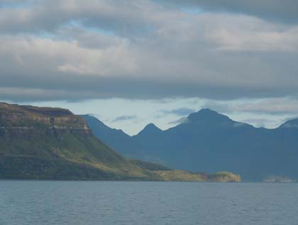 The short crossing from our overnight berth in Inverie to the Isle of Eigg was simply amazing. A full moon was clearly visible in the pale morning light hovering above the rugged outline of the Isle of Rum. The sun was rising and bathing the Small Isles (Eigg, Rum, Muck and Cana) in its dawn glory and reflecting perfectly off the calm waters as we ploughed forward. To make the scene even more perfect a minke whale popped up beside the ship as we approached the entrance to the sheltered bay on the Isle of Eigg where we would come alongside.