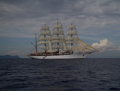 The Sea Cloud arrived in Ithaca, the second smallest island in the Ionian Sea and home to Odysseus, in the early morning, on a cloudy but warm day. We tendered ashore where the statue of Odysseus was waiting to welcome us! Ithaca is small and rugged, but still one of the best-kept secrets of our islands, and a place with a long maritime tradition. Vathy, the main port and capital, is a nice small quiet town hiding in one of the most concealed and protected natural bays of Greece, in the old days hiding from the pirates but nowadays only from the strong winds. It’s a tiny port, but many sailboats prefer it and come to enjoy the sweetness of the land and the legends associated to the cunning king Odysseus, the “man of many devices.”