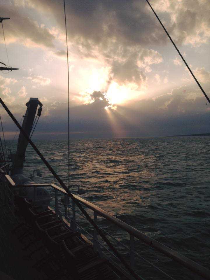After hours and hours of more stormy weather the clouds finally began to break up and the sun finally began to peek through right before sunset. We sipped cocktails and watched the rays on the golden sun filter through the pink and purple clouds before we went into the dining room for a lovely four course meal. We chattered the night away and attempted to dance and sing for our Greek guide Sophia on her birthday. Before we knew it, it was time to go back up to the Lido which after a few minutes was flooded with 20 sailors in white tackle blouses. Everyone joined in and sang along; we even attempted to sing in German and Tagalog! It was fun to chat with the crew before we went off to bed, praying that the weather gods would be kind to us the next day!