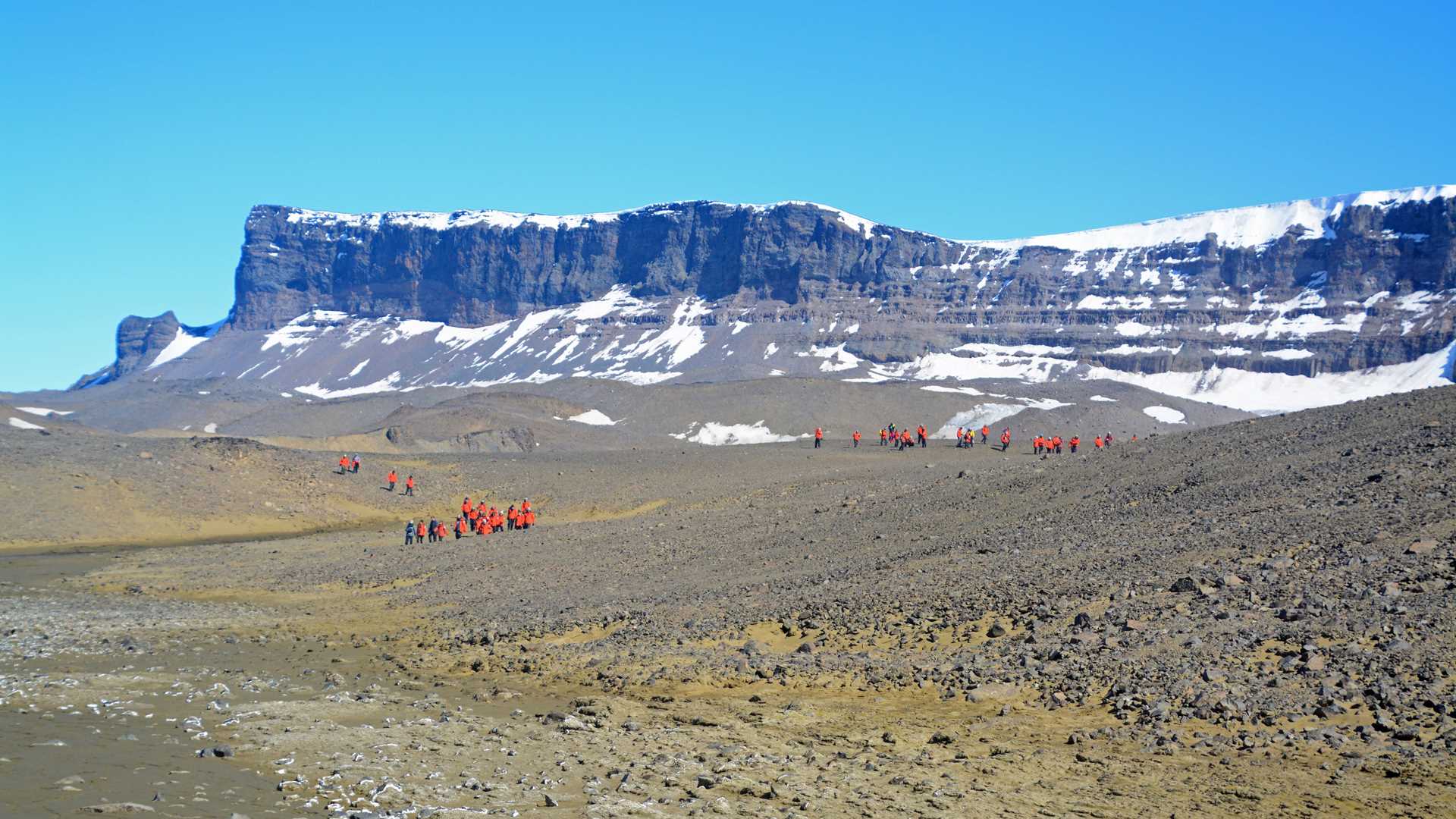 Our first landing of the voyage was on James Ross Island, part of the Antarctic Peninsula, in the Weddell Sea. Glaciers incised the island, attaching it to the peninsula by ice shelves until the mid-1990s. The island is composed of volcanic and sedimentary rock with fine glacial silt mixed in. Snow and ice cover the higher plateau areas.