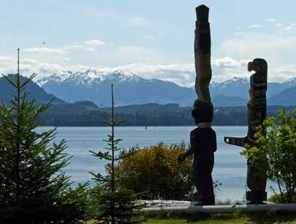 During lunch we docked at the village of Alert Bay, and disembarked to meet and experience the culture of this native people. We were welcomed by the calls of ravens and eagles. Our first stop:  U’Mista Cultural Center, housing quite a bit of Kwakwaka’ waka potlatch regalia from the early 1900s along with other museum pieces, and a gift shop with beautiful local artisan crafts including carvings and jewelry. After the museum we headed uphill toward the tallest totem pole in the country, living outside the Big House of the Tsasala Cultural Group. Entering the building was like being transported to another time or place. We stepped onto the dirt floor of this huge open cedar-walled room, with cedar benches along the side walls, tremendous native carvings along the back and front walls, and a fire in the center, its smoke wafting up to exit through a raised vented central part of the ceiling. Sunlight radiated through the slats from the ceiling vents, providing a gorgeous ethereal quality. We were invited to sit along the side wall, and at the back wall (now to our right) sat the drummers/singers behind a massive carved-out tree log that served as drum. In front of the singers were benches, where some of the members sat to watch and support those performing around the fire. The Tsasala people performed some traditional dances for us, in between explaining their significance, and introducing some of the younger people. They continue to practice and pass on their culture to younger generations while simultaneously navigating the modern world of school and work and technology. There was an ease and comfort being in their presence, and a clearly felt generosity of heart and spirit. To culminate the performance, dancers came and handed scarves to us in the audience, an invitation to join them in dance around the fire. And afterwards, a feast of delicious wild salmon, and a native treat of fried bread with homemade jams. Yum!