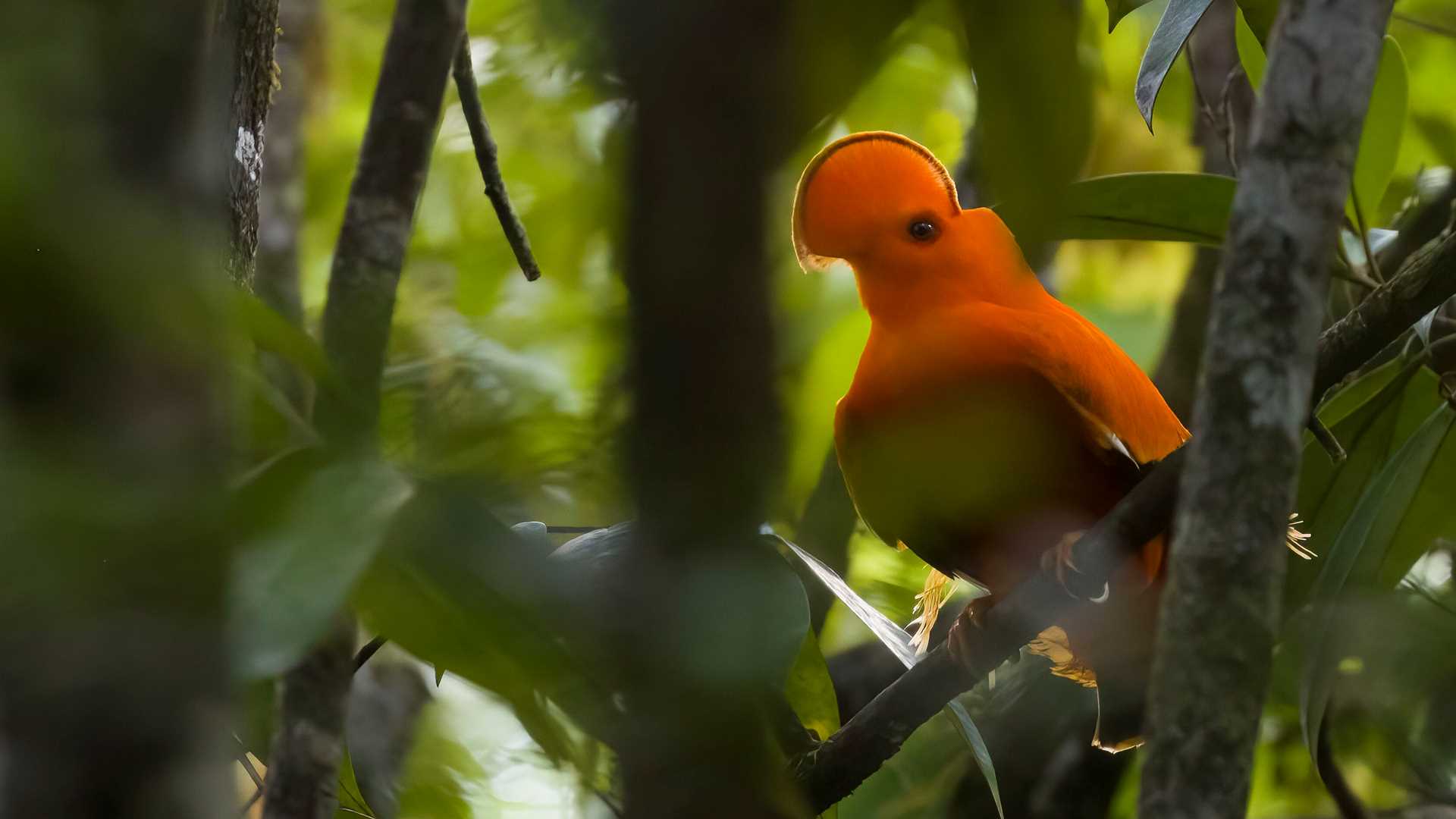 Although the waterfall itself is worth the flight to this very remote location that is inaccessible by other means, we also had the opportunity to learn about the tropical rainforest and many of its inhabitants. We walked several jungle trails to various viewpoints and saw an astonishing variety of plants. In some of the large bromeliads, small pools of rainwater accumulate at the base of the leaves. In these pools, we found several small frog species, including the gorgeous golden rocket frog. Birders and non-birders alike enjoyed watching a group of Guianan cock-of-the-rock males. They competed for the attention of females at a lek. Leks are specific patches of forest that males use for display during the breeding season. What a truly beautiful bird and a highlight for all the birders onboard!