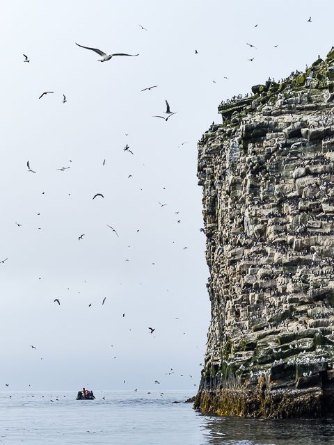 We arrived early this morning off Kamen Ariy, an amazing islet off northwest Bering Island, the westernmost Aleutian Island. The temperature was 6o C and the sea surface under low cloud cover like smooth, silvery billows as we set forth in our fleet of Zodiacs. Kamen Ariy is amazing for two reasons: first is the geology, as it is formed of columnar basalt with the columns positioned is such a way as to provide myriad nesting sites for birds; second is that every possible nesting site is being occupied by nesting seabirds—tens of thousands of them. Common and thick-billed murres nested shoulder-to-shoulder on narrow ledges. Tufted and horned puffins and smaller auklets occupied the highest ground. Kittiwakes shared the basalt cliffs lower on the island and here the black-legged kittiwakes nested side-by-side with the rare red-legged kittiwakes—of which we saw many! Red-faced and pelagic cormorants were resplendent in their breeding plumage. Young northern fur seals romped near kelp beds and giant Steller’s sea lions had a small rookery on the rocks.