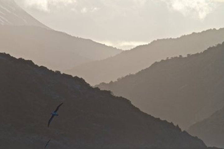 Our initial intent today was to begin exploration of the Karukinka Reserve, a recently set-aside wild landscape of Tierra del Fuego, Chile. As the morning developed we soon realized that the wind conditions would not be favorable to land or take Zodiacs out exploring. Nevertheless, the views of this fjord land/seascape were stunning to say the least. Black-browed albatross pierced the wind effortlessly, giant petrels, white-chinned petrels, and southern fulmars acted as supporting characters in this blustery ballet on a stage of broiling seas, with snow and ice-capped jagged peaks as the backdrop.