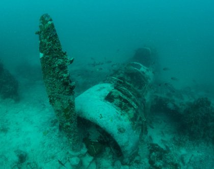 We then moved back into the sheltered waters and dropped into about thirty feet of water on the wreck of a Japanese warplane from World War II.  An Aichi, or “Jake”, was mostly intact, even though it has been on the bottom here for about seventy years.  It is slowly being reclaimed by the sea, with corals growing all over it, and many fish using the wreck for a home.  Glassy sweepers filled the cockpit, while squirrelfish were sleeping below the wings. An eerie, but exciting dive.
