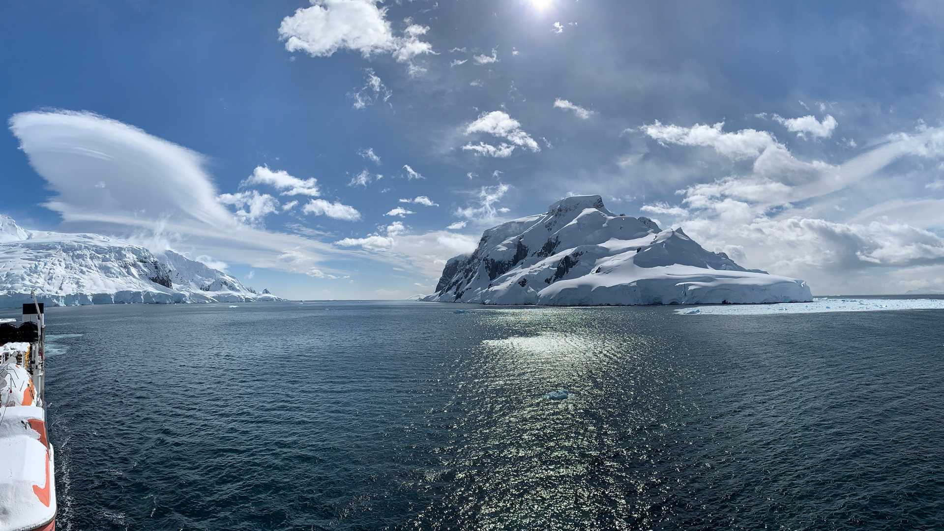 After a windy afternoon and evening yesterday, we continued the search for calm seas. Our morning navigation along the eastern coast of Brabant Island yielded some calm patches from which to observe the gorgeous glaciers all around us. In Kayak Bay, we thought we might have found conditions that would allow for an off-the-ship activity, but the gusts were simply too strong. We settled for a morning of exploration by ship. We passed several humpback whales, many gorgeous icebergs, and enjoyed the sunshine as it lit up the mountainsides all around us.