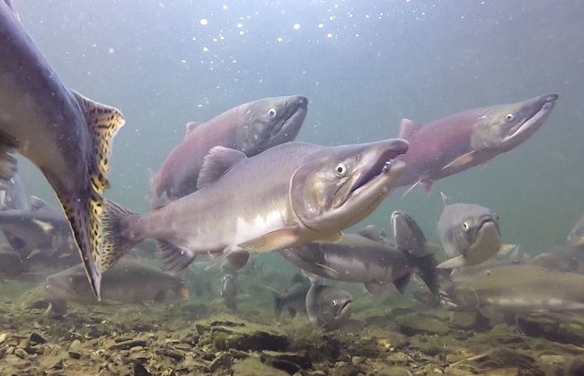 After a morning full of activities, we sailed around the northeast corner of Baranoff Island and entered Peril Strait to get to Lake Eva; we all went ashore and engaged in different types of hikes, from aerobic to moderate and photo walks. Lake Eva’s trail was created by the Forest Service and is a pleasure to hike; wide and with layer of gravel, it is easy on our feet and allowed us to admire the forest around us instead of worrying about our footing. Lots of bear poop and other signs, like chewed-up wood posts, reminded us that we are in bear country. Brown bear country! At a small and picturesque pond we watched numerous creatures in the shallow water including pink, chum, and sockeye salmon, plus cutthroat trout and Dolly Varden char; I got in the water to drop a couple of weighted cameras to get some footage with a unique fish’s point of view. The abundance of fish reminded us that the health and lush aspect of the forest is in direct relationship with all the nitrogen, phosphorous, and other nutrients that the salmon bring back from the ocean. A wonderful relationship between the forest and the sea, made possible by a remarkable fish.
