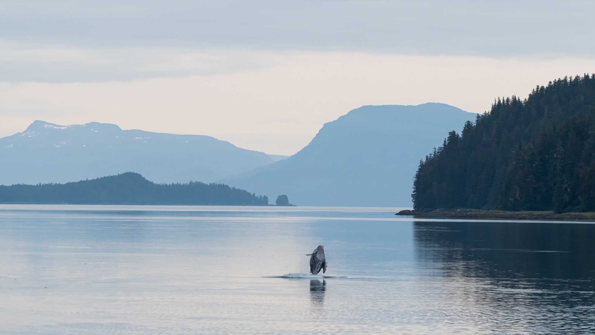 Just as breakfast ended, the calf began to breach and tail slap as it waited for its mother, a perfect Southeast Alaska picture completed by layers of islands and mountains behind it. Some of us hopped into kayaks to explore the mouth of a salmon stream, catching glimpses of bears fishing for salmon and harbor seals resting on a sand bar. Others went out in Zodiacs to watch the humpback whales and came upon one sleeping at the surface, breathing every few minutes.