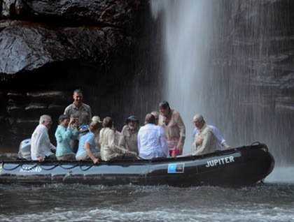 Despite the knowledge of fresh water crocodiles inhabiting the pools on top of the falls, we could not resist the call of the inviting water and slipped in for a refreshing swim. Once fully rejuvenated from our climb, we slowly made our way back down 100 meters below to our waiting Zodiacs.