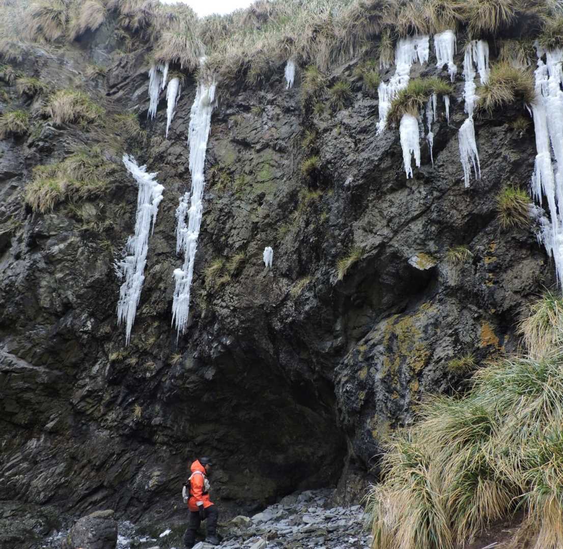 By midday, we had reached the mouth of King Haakon Bay in the southwestern region of South Georgia. This presented us with one of the few good landing regions on the southern coastline of the island.  It is of great importance to us because it was here that Ernest Shackleton and five of his men arrived from Elephant Island in a small boat (the James Caird) after the destruction of his ship Endurance the previous year. Our first destination was Cape Rosa, where Shackleton’s group landed after a horrendous sea journey of 800 miles over 16 days. They arrived here on May 10, 1916—100 years ago. We were also able to land, which gave us an appreciation for the elation they must have felt by getting solid land under their feet again. They spent four days recuperating here by feasting on fat wandering albatross chicks and resting in a small cave they named Cave Camp. But they knew they still had to somehow get across the island to the north side to the whaling settlements for any real salvation.
