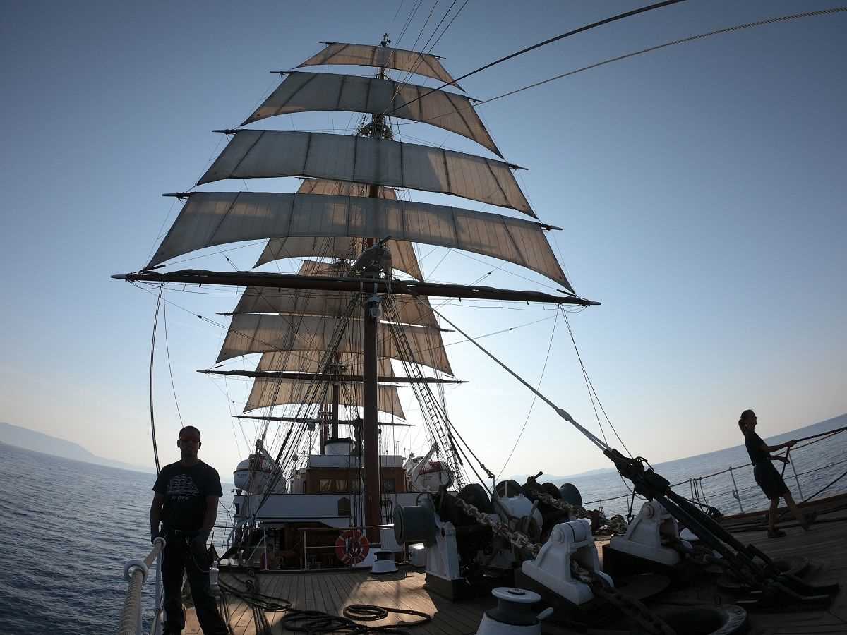 Guests awoke to find that Sea Cloud was once again in Croatian waters, sailing south of the island of Korcula and east of Lastovo Island. At 8:00 that morning, sailors hit the rigging and put up a fine array of sail on a somewhat windless morning. Still, Sea Cloud made a speed of a couple knots for most of the morning. National Geographic Expert Grace Fielder gave a well-received talk on the preposterous Fourth Crusade, and once again, a cadre of Lindblad guests assisted the sailors and deckhands in bringing in the sails and in working the lines in the heat of the late morning.