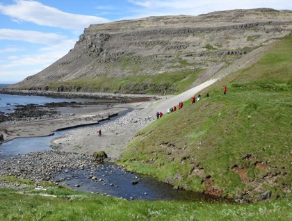 After lunch we anchored in FjortendeJuliefjord and split into several energetic groups to enjoy the unusual landscape. The long walkers were put ashore on a cobble beach and climbed ridge and bluff to a cairn at over 1000’, with outstanding views of the surrounding glaciers. Others took to the kayaks, and paddled close under the cliffs for splendid views of everyone’s favorite, the North Atlantic puffin. Others walked with Rich for a photographic expedition (proof attached) and the rest of us explored the lower slopes.