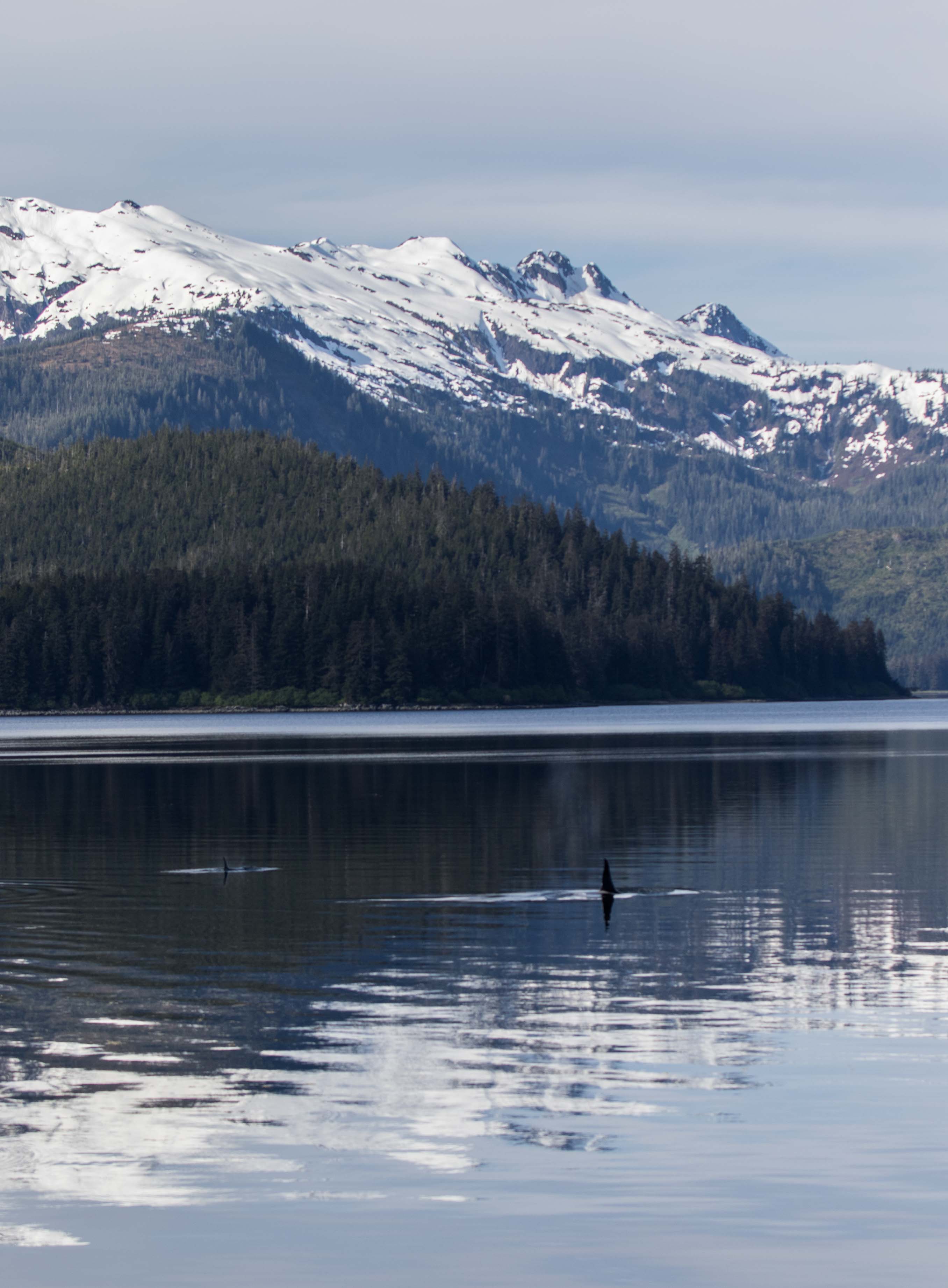 The final day of our 15 day expedition brought us many surprises and plenty of activity. All of us seasoned Alaskan travelers feel as if we have falsely represented the normally cloudy state, for once again the weather was perfect and not a cloud in the sky. At 0700 people were wearing t-shirts up on the bow. The initial morning plans were slightly delayed when naturalist David Stevens adroitly spotted a small pod of orca off of Morris Reef during breakfast. With a quick radio call to Captain Sinclair, we soon found ourselves clutched out and waited as the pod headed straight towards us. There was only one large male and what appeared to be multiple very young orca hunting beside the matriarchs of the family. The National Geographic Sea Lion was clearly no threat to these magnificent creatures for they remained in close proximity for nearly an hour. At one point four of them drifted along the entire length of the ship within a foot of the hull. All the photographers were torn between focusing on detail shots of the orca or widening their lenses and incorporating the snow covered peaks and their reflections slightly disrupted from the orcas movements.