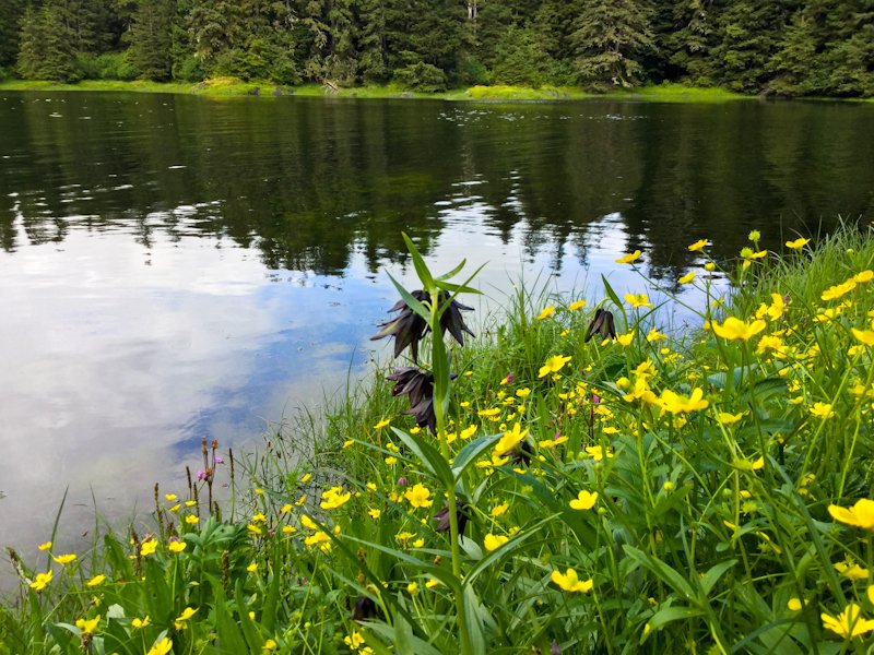 Situated on the north coast of Baranof Island, the trail to Lake Eva leads through some of the most beautiful rainforests in Southeast Alaska. It visits a variety of habitats, from meadows filled with flowers to towering old growth. A tidewater bay, which is accessible to kayaks, heads to a waterfall. From here the stream continues to a gorgeous lake, complete with nesting loons. On the edge of this lake are some of the most massive trees around. Here is a cathedral grove of Sitka spruce that reach 200 feet tall and wide enough that it takes about seven people linking arms to encircle it. We spent the morning walking, kayaking, and photographing this gorgeous spot that could easily be a national park elsewhere in the world.